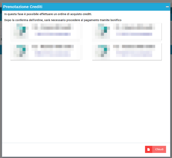 I crediti saranno subito disponibili per l’utilizzo, anche se saranno contrassegnati come temporanei. A seguito della ricezione del bonifico, verrà emessa fattura e i crediti saranno contrassegnati come pagati. I crediti temporanei che non risulteranno pagati verranno eliminati dopo qualche giorno dall’ordine. E’ possibile fare un unico ordine alla volta. Il sistema inibirà altri preordini fino a quando l’ordine precedente non verrà concluso.