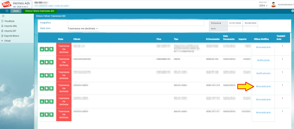Le fatture inviate a SDI e scartate, risulteranno con uno stato Trasmessa ma Declinata. Le notifiche di scarto devono essere controllate dal menu: Documenti→Elenchi→Elenco Fatture Attive SDI