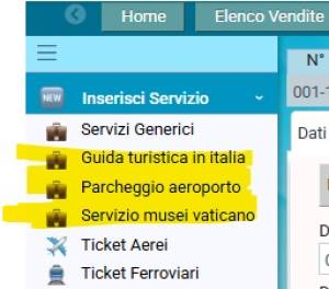 Cliccando su queste voci, verrà aperto il caricamento del servizio con i parametri territorialità / tipo vendita / tipologia servizio (Parcheggi, ristoranti, guide, etc.) già impostati come previsto dalla categoria.